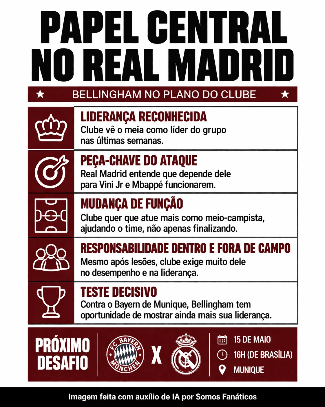 Na contagem regressiva para o confronto decisivo Real Madrid x Bayern de Munique, Jude Bellingham se destaca como uma figura central no plano tático do clube merengue. Em uma comunicação interna, a diretoria enfatizou a importância do meio-campista, apontando que seu desempenho será crucial para potencializar as estrelas do ataque, como Vinícius Júnior e Kylian Mbappé.