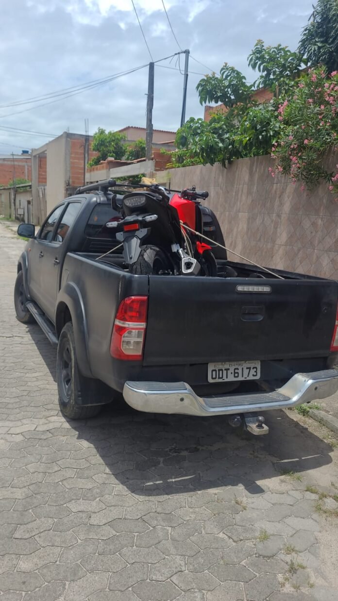 Após denúncias de que havia um veículo com restrição na localidade, as equipes realizaram diligências para apurar os fatos e constataram uma motocicleta vermelha modelo CB 300 Twister sem a placa, no interior do imóvel. A consulta ao chassi confirmou que o veículo estava vinculado a uma ocorrência de furto e roubo.